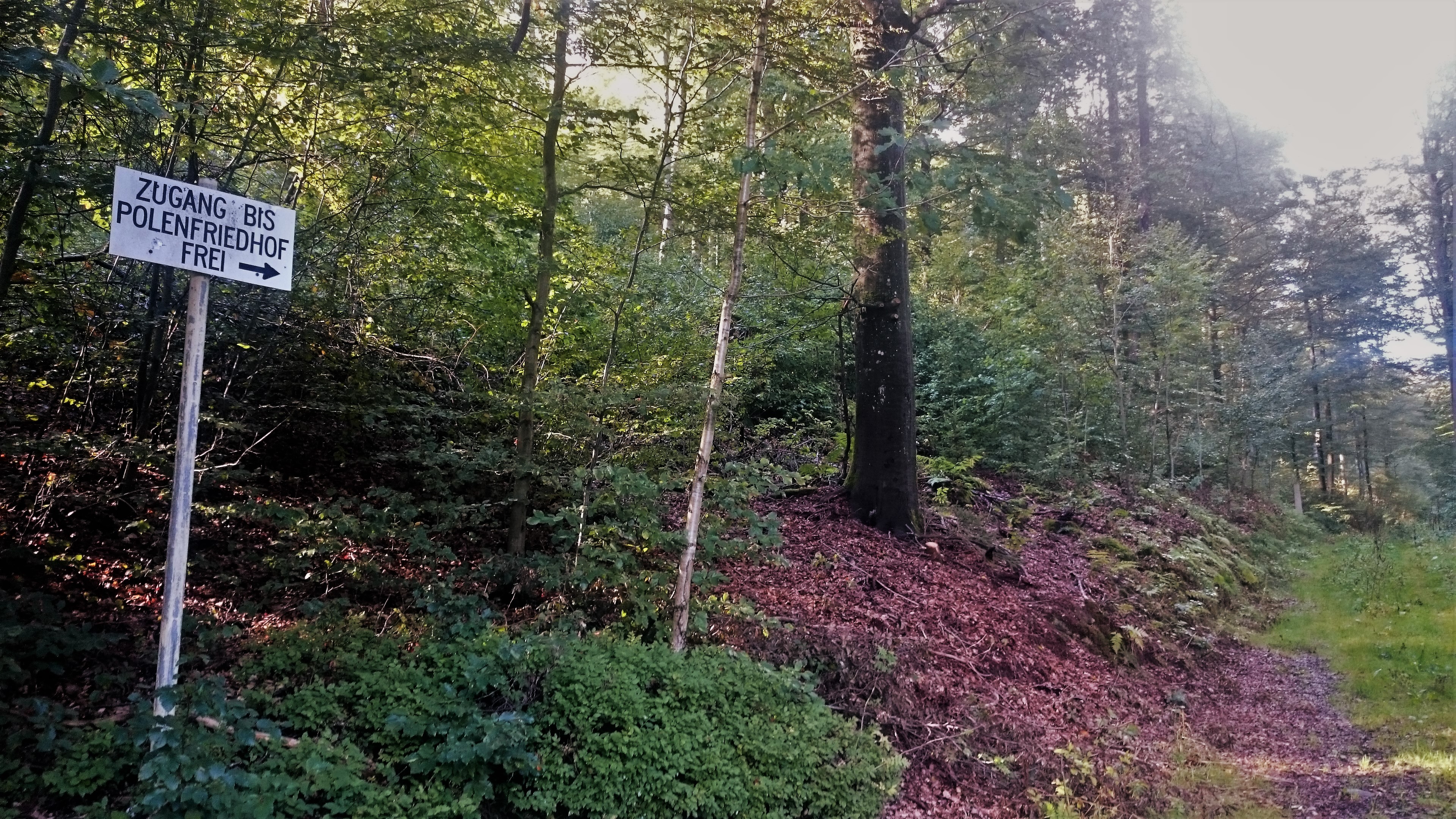 As we were leaving the village, having all but given up, a signpost pointed to the left , ‘Polenfriedhof‘ it read, the Polish cemetery. Taking a left turn, along the edge of the forest to the east another sign read “Zugang bis Polenfriedhof Frei“. All other parts of the military camp are strictly off limits, but we could follow the path up to the Polish cemetery through military terrain. This is the place where the old, the sick and the very young were laid to rest. Freedom did not bring new life for all.